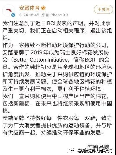 刚刚,安踏官方微博@安踏体育发表声明称,注意到了近日BCI发表的声明,并对此事严重关切,我们正在启动相关程序,退出该组织。声明还称,安踏一直采购和使用中国棉产区出产的棉花,包括新疆棉,在未来也将继续采购和使用中国棉。